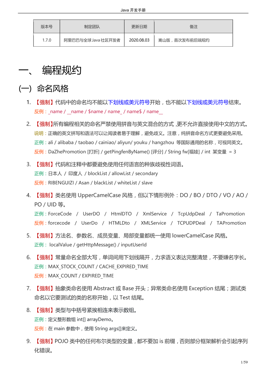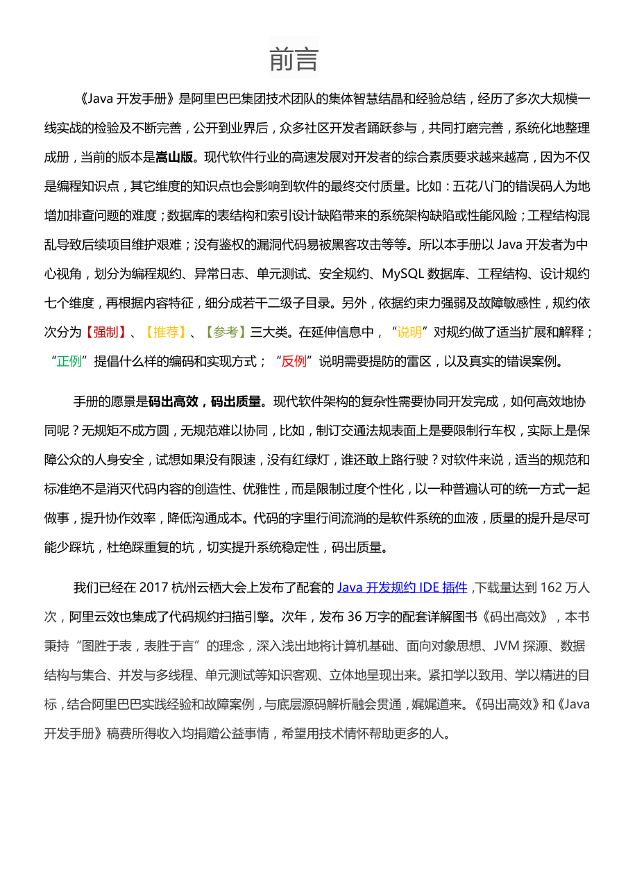 | 72 阅读《Java 开发手册》是阿里巴巴集团技术团队的集体智慧结晶和经验总结,手册以 Java 开发者为中心视角,划分为编程规约、异常日志、单元测试、安全规约、MySQL 数据库、工程结构、设计规约七个维度,再根据内容特征,细分成若干二级子目录。另外,依据约束力强弱及故障敏感性,规约依次分为【强制】、【推荐】、【参考】三大类。