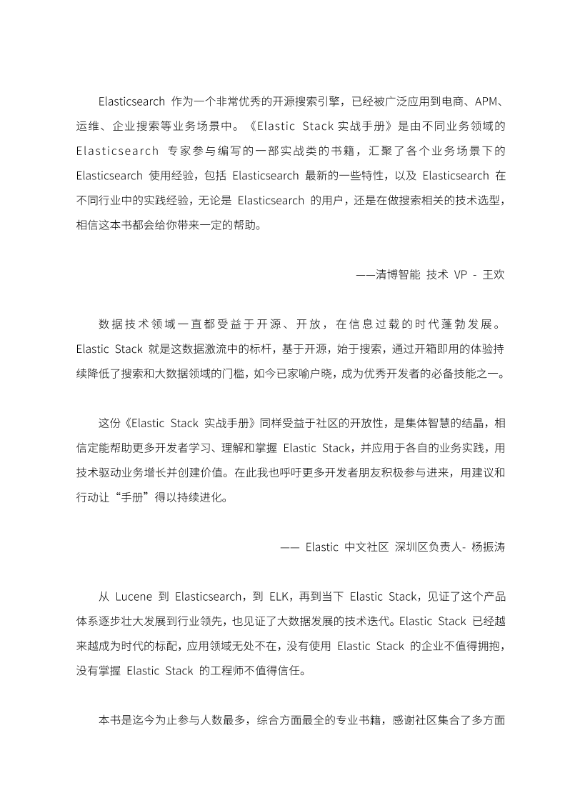 | 52 阅读本书从案例出发,不仅详细地介绍了 Elastic Stack 的各个功能组件的具体用法,还提供了不少来自一线的宝贵实践案例分享,不管是对于刚接触或是想要了解 Elasticsearch 更多知识的同学,本书都具有很好的参考价值。
