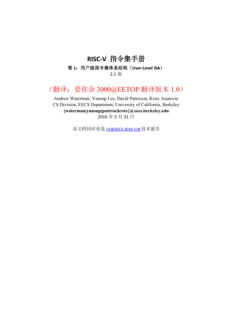 | 32 阅读RISC-V 指令集手册 卷1:用户级指令集体系结构 2.1版。