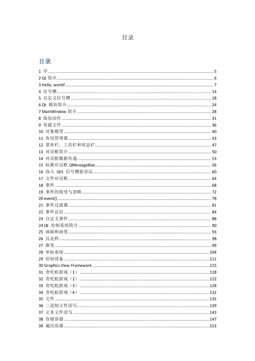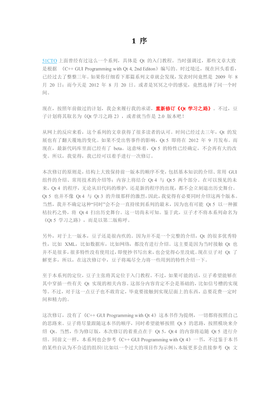 | 43 阅读本文档结构上大致保持前一版本的顺序不变,包括基本知识的介绍、常用 GUI 组件的介绍、常用技术的介绍等;内容上将结合 Qt 4 与 Qt 5 两个部分。