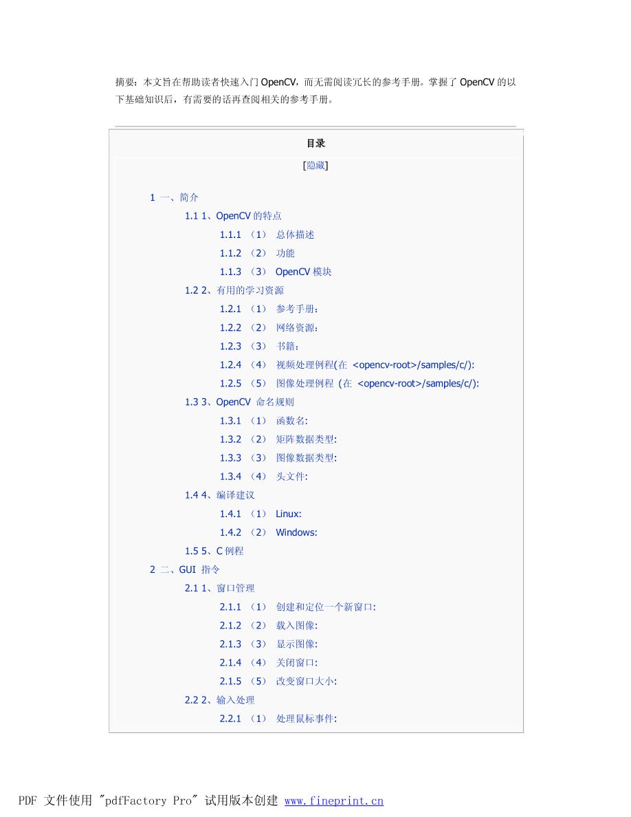 | 1 阅读本文旨在帮助读者快速入门 OpenCV,而无需阅读冗长的参考手册。掌握了 OpenCV 的基础知识后,有需要的话再查阅相关的参考手册。