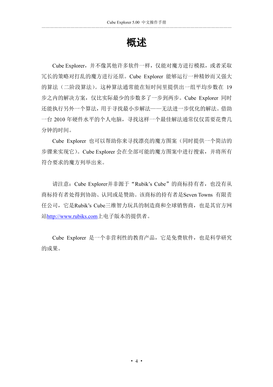 考虑到实用性和普及率,本手册只对说明文档的“Overview”和“Exploring the Cube”部分进行了翻译。“The Mathematics behind Cube Explorer”等章节的内容请参考后续的汉化资料。 本手册推荐配合Cube Explorer 5.00 汉化版进行使用。该汉化版下载地址为:http://bbs.mf8.com.cn/viewthread.php?tid=50160