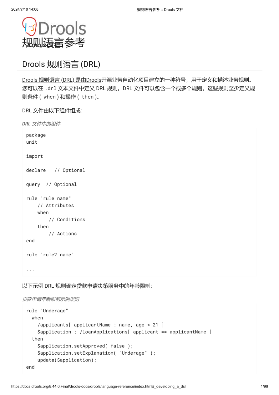 | 7 阅读Drools 规则语言 (DRL) 是由Drools开源业务自动化项目建立的一种符号,用于定义和描述业务规则。