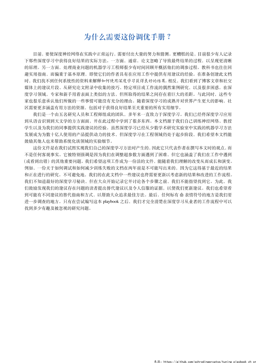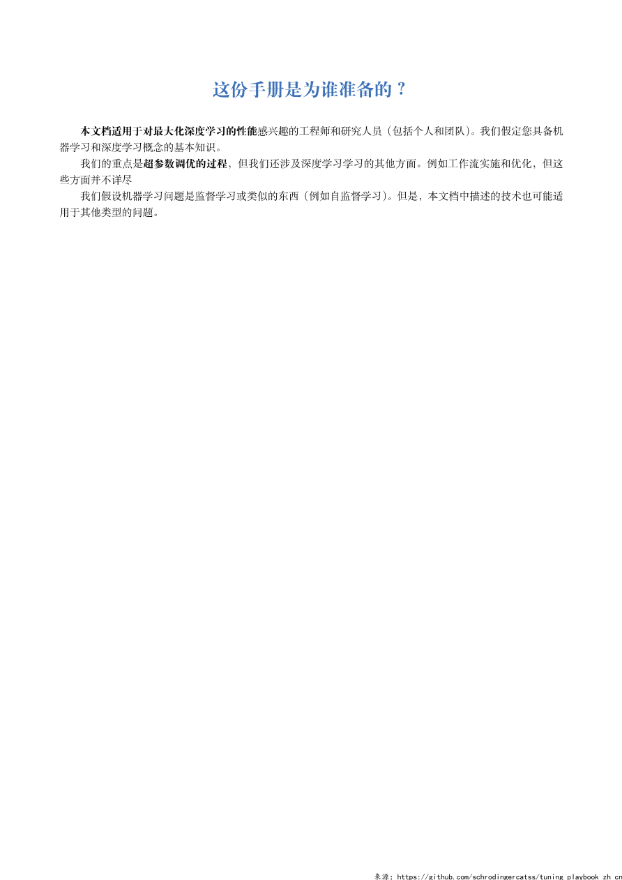 我们的重点是超参数调优的过程,但我们还涉及深度学习学习的其他方面。例如工作流实施和优化,但这些方面并不详尽我们假设机器学习问题是监督学习或类似的东西(例如自监督学习)。但是,本文档中描述的技术也可能适用于其他类型的问题。