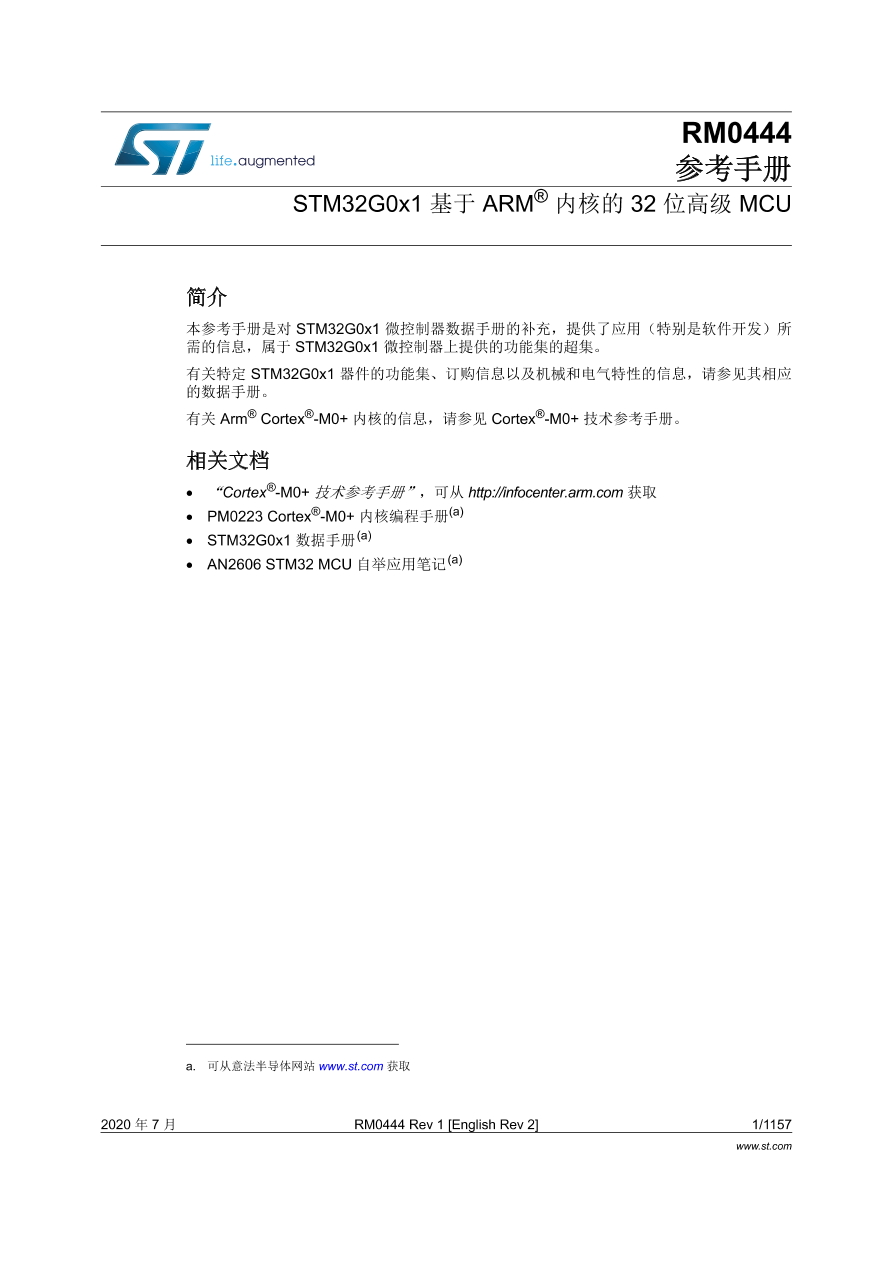 | 7 阅读本参考手册(RM0444)是对 STM32G0x1 微控制器数据手册的补充,提供了应用(特别是软件开发)所需的信息。