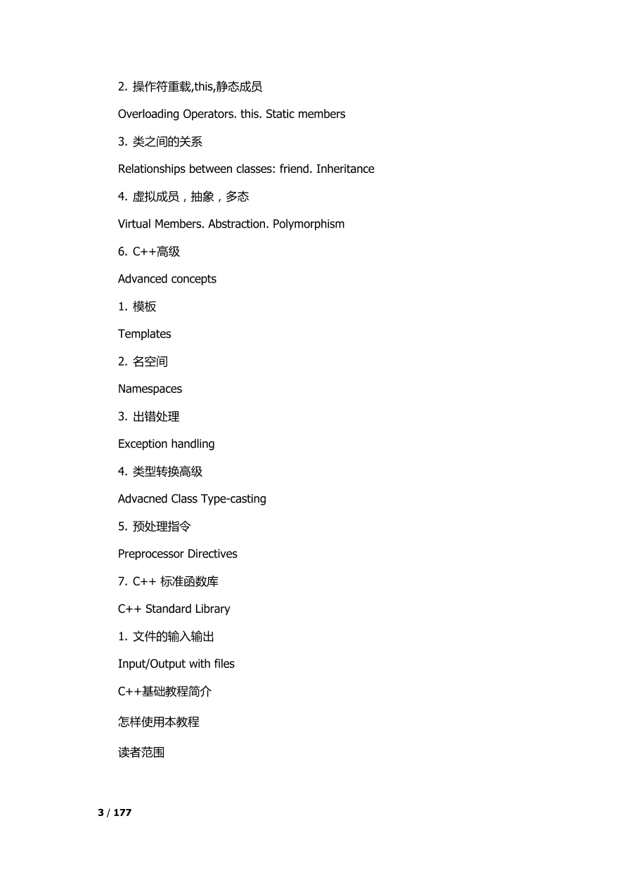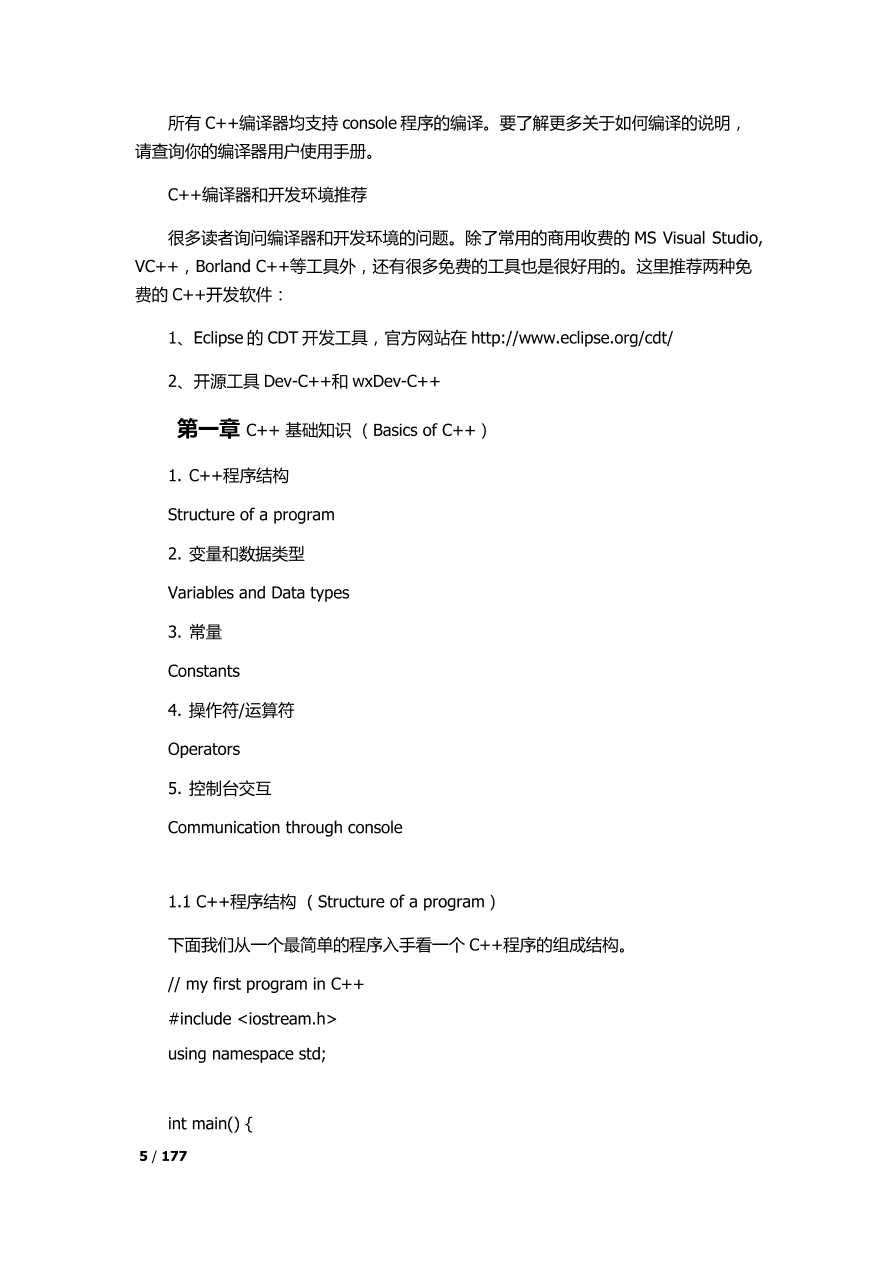 | 52 阅读本教程对 C++语言进行了深入浅出的介绍,从基础知识到 ANSI-C++标准的最新功能,内容涵盖了从数组,类等基本概念到多态、模板等高级概念。教程本着实用的原则,每一小节都结合了可以工作的程序实例,以便读者从第一课开始就可以上手实习。