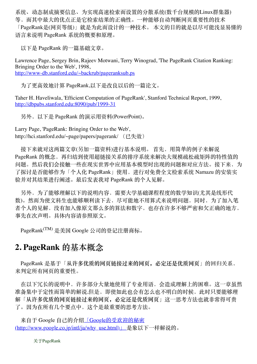 本文对作为评价甚高的搜索引擎 Google 的核心技术之一 PageRank (网页等级)的基本的概念和评价原理进行解释。